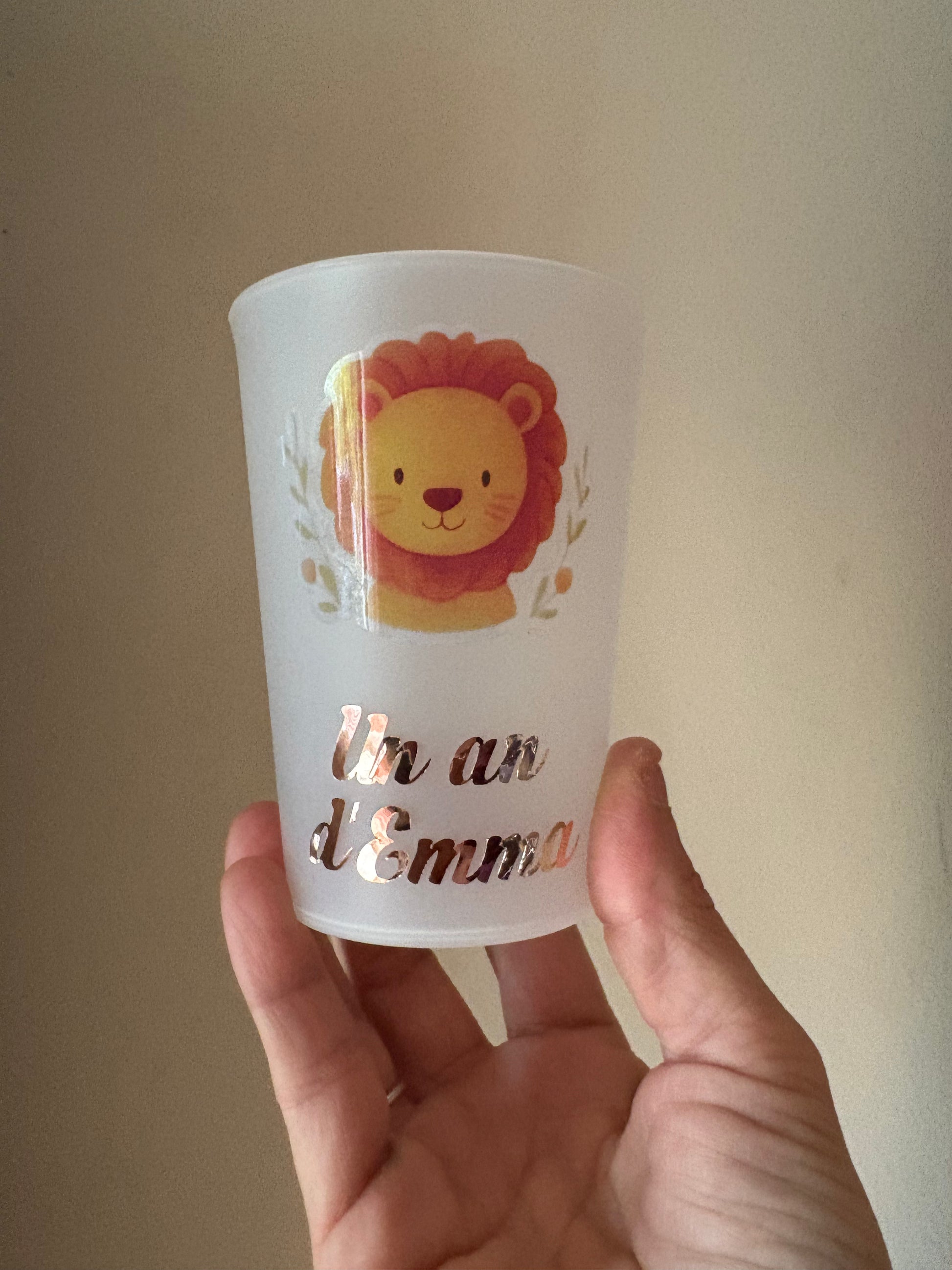 Nos gobelets transparents thème animaux (girafe, ours, éléphant, lion) sont personnalisés avec le prénom et la date de l’événement.